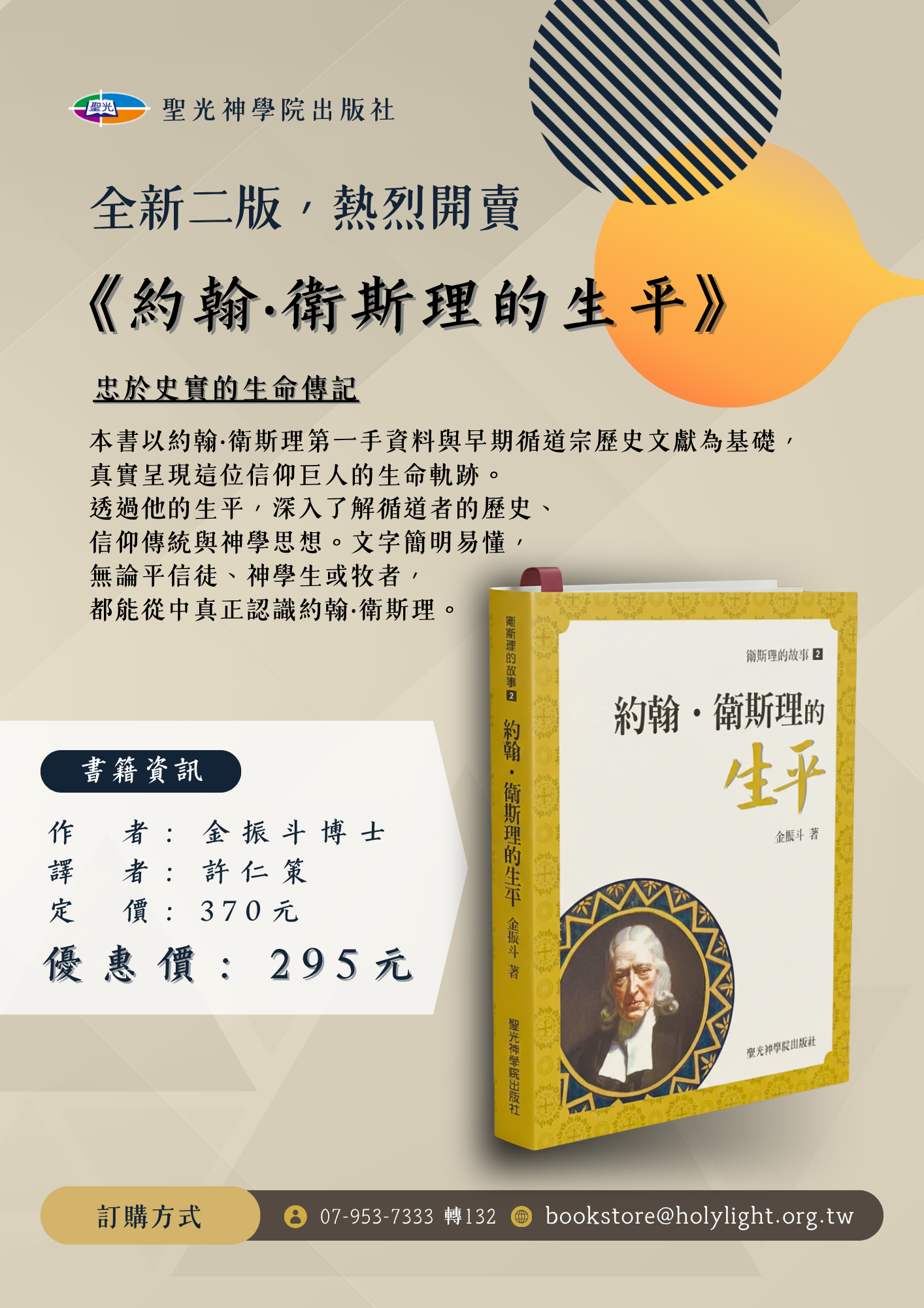 適逢聖光神學院建校七十週年之際,我們欣喜宣布金振斗博士的經典著作《約翰衛斯理的生平》修訂再版問世。這本於2015年首次出版的重要傳記,經過十年時間的沉澱與驗證,在華人教會中廣受好評,如今經過仔細比對原文、詳細修訂內容後,以更精準完整的面貌與讀者重逢。